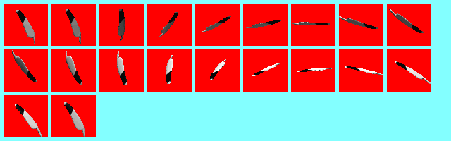 To better show you what I mean, below is the sprite sheet for the kittiwake feather from the Devil's Reef metaroom. I've changed the background to red so it's easier to see, since the feather has dark barring on it.