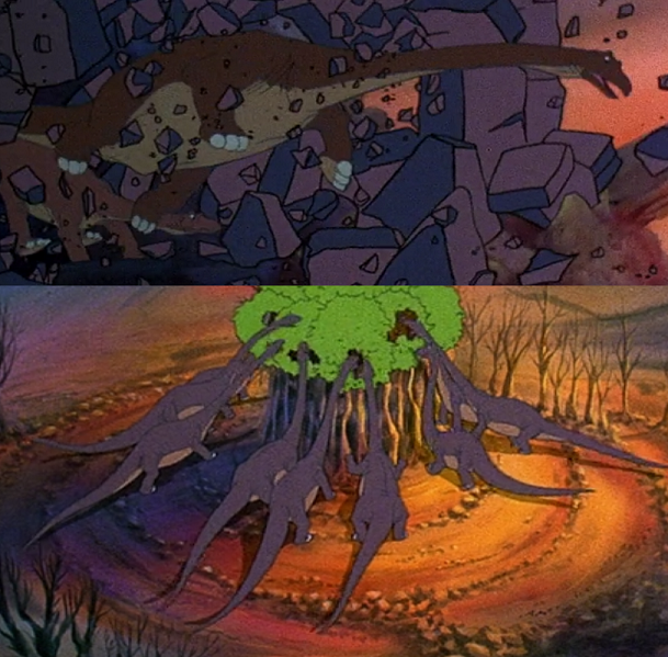 Apatosaurus The studio model sheets for the first film identify the "Long Necks" as Apatosaurus. Elephant-like feet aside, they are a very good rendition of Apatosaurus, especially Littlefoot's mother. It's funny that Littlefoot's grandparents have shorter, camarasaur-like heads and are depicted in some scenes wading in a swamp, as though the "older generation" of Apatosauruses are actually based on outdated ideas of Brontosaurus, back when it was still reconstructed with the wrong head, and the "younger generation" of Apatosauruses have a more modern look with more accurate features and behavior. The fact that Brontosaurus is a separate species no matter how you look at it (Brontosaurus or Apatosaurus excelsus, while the "true" Apatosaurus is Apatosaurus ajax) makes this a little odd from an in-universe perspective. I suppose you could theorize that she was adopted. And of course Grandpa and Grandma Long Neck are only wading in that swamp because they're old and have joint pain and the water plants are easier to chew, thank you very much. |