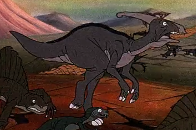 Parasaurolophus In The Land Before Time, the skeleton that Littlefoot's egg rolls down at 6:20 is that of a Parasaurolophus, as shown by the distinctive head crest. Later we see one or two fleeing the earthquake at 18:17. |