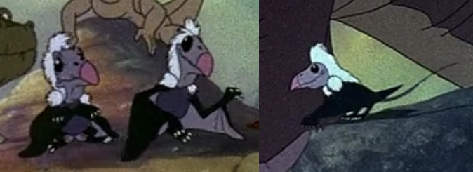 Dimorphodon Some kind of pterosaur that appears in The Land Before Time at 22:20. The script only refers to them as "Pterodactyls", and when their mother flies away at the end of their sequence in the film, we can see that she has a long tail with a flange at the end, not like Pteranodon at all. Given their domed beaks, the pterosaur that best fits their description is probably Dimorphodon. It isn't known to have a head crest, but then, it seems that several of the long-tailed "rhamphorhynchoid" pterosaurs had soft-tissue head crests that often don't preserve during fossilization. It's possible that some future discovery will prove that Dimorphodon was one of these pterosaurs, but for now we don't know. |