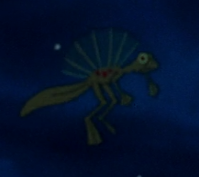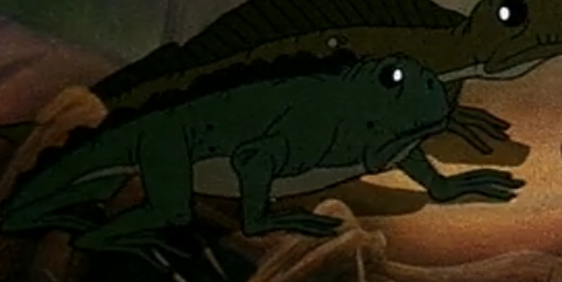 Hypuronector Appears in the first few minutes of The Land Before Time. Although it does look a lot like a newt, and indeed the script identified it as a "salamander", the first thing that came to mind to me was that it looks like a Hypuronector with a hypothetical dorsal fin. Hypuronector (which means "deep tailed swimmer") was only given a name in 2001, but according to its description it was known by the same name informally for over two decades before that—so, at least as far back as 1981, which is plenty long enough to have inspired the critter we see in The Land Before Time. This would explain the critter's skinny long legs, which are a distinctive feature of Hypuronector. |