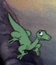 Compsognathus A small cute reptile visible in The Land Before Time at 7:40. It could be one of the smaller predatory dinosaurs like Compsognathus or Coelophysis. When we see it in the next shot (if this is the same creature), its coloration looks green instead of reddish and it has a very pointed triangular snout with a bit of an underbite. |