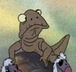 Gerrothorax A very cute critter visible in The Land Before Time at 7:40. Either a reptile or an amphibian but it's difficult to say which. The eyes in particular remind me of an amphibian. This could be a Gerrothorax or something similar. |