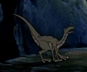 Ornithomimus First appears in The Land Before Time. The egg thief that tries to steal Littlefoot's egg at 6:10 is identified in the studio model sheets and the script as an Ornithomimus. It looks very similar to the Struthiomimus that appear in The Great Valley Adventure, but it has more stripes on its legs and a ridge on its back. Coloration varies quite a bit depending on the lighting, but once it emerges out of the shadows you can see that it isn't really as dark as it appears in the first screenshot. |