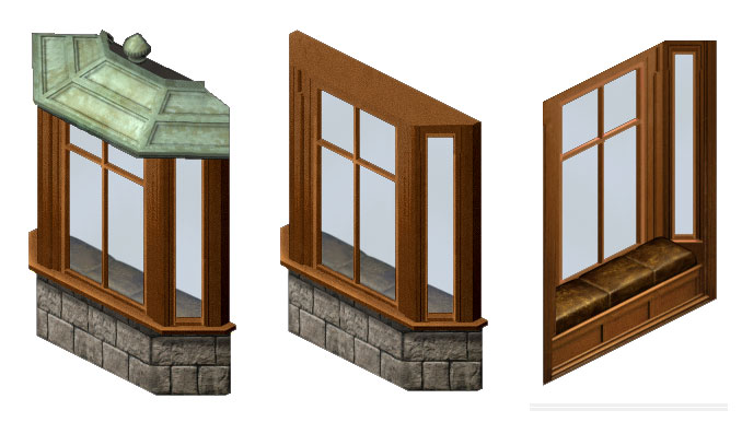 Bay windows![]() Click to view full size Coordinates with the wall and floor set listed above, or just the regular Reichtenstein castle walls. There are two bay windows included: one has the copper roof, and the other does not have a roof, in case you want to put something on the floor above it. They look the same from the inside. Based on the bay windows from the Home Project at Marina's Sims. |
