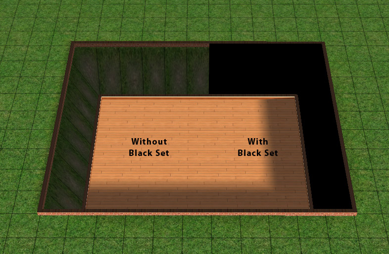 A matching wall and floor. I personally find "dead space", such as the ground underneath basements, to be distracting. So I created a black wall and floor to use on such areas. They have no shading—they are solid black.