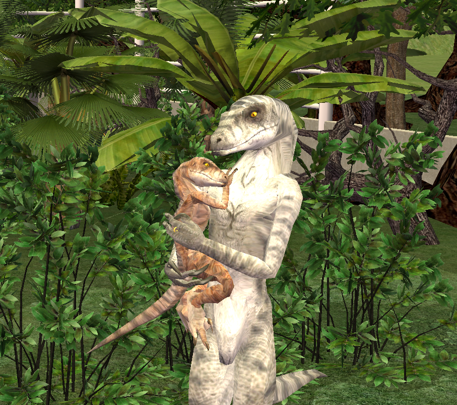 And no, the bump on their crotch is nothing awkward. It's the raptor's hip bones, which stick out in a funny way because they anchor the raptor's powerful leg muscles. JP raptors did not have this in the first two films due to a scientific goof, but they do have it in the third film, and I have chosen to include it for the sake of biological accuracy.