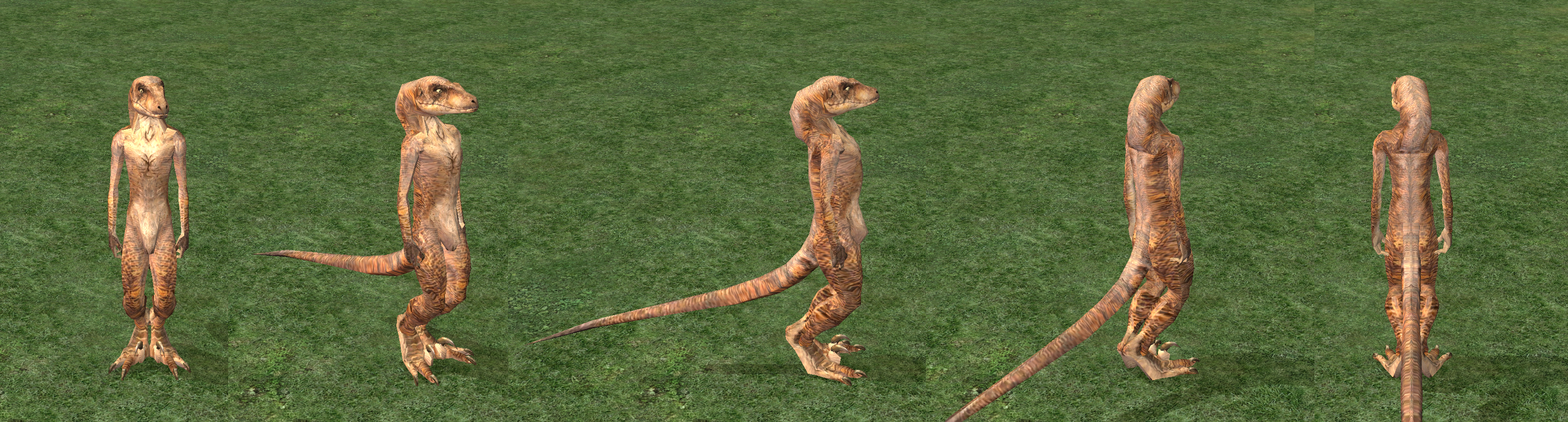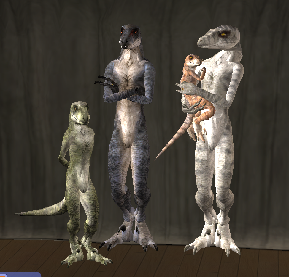 Here is everything you need to create Velociraptor Sims: raptor bodies ("outfits") for males and females, from toddler to elder, for all occasions. Also included are eleven raptor skintones: some based directly on the Jurassic Park series, and some variations designed to add a little more diversity to your raptor pack.