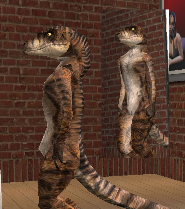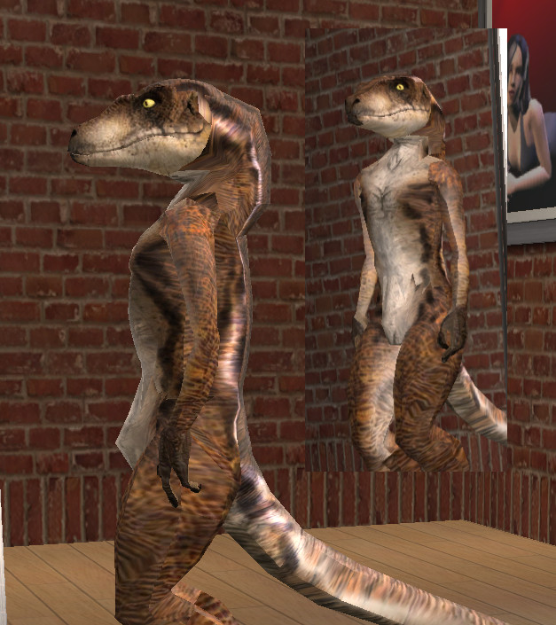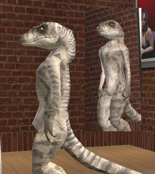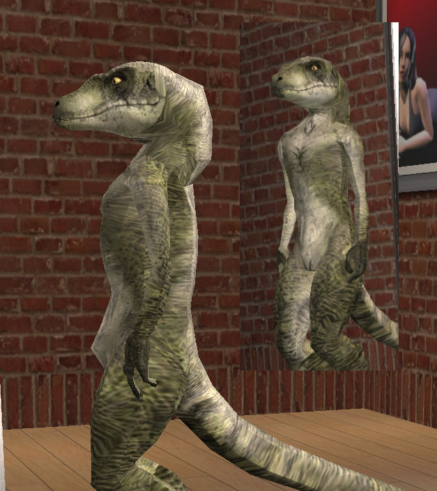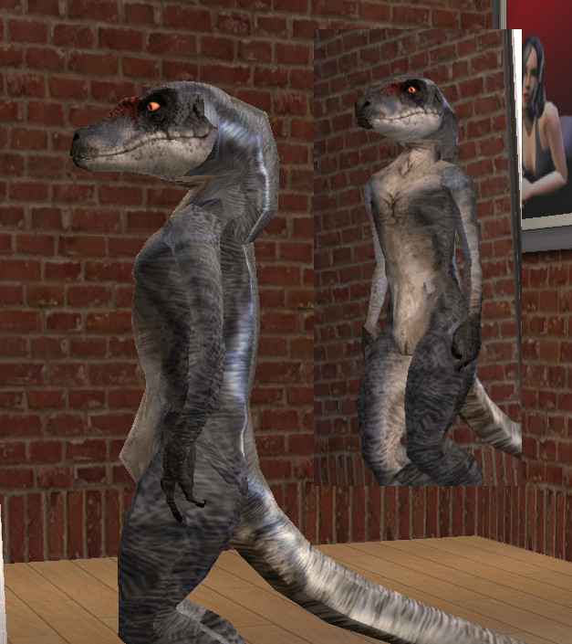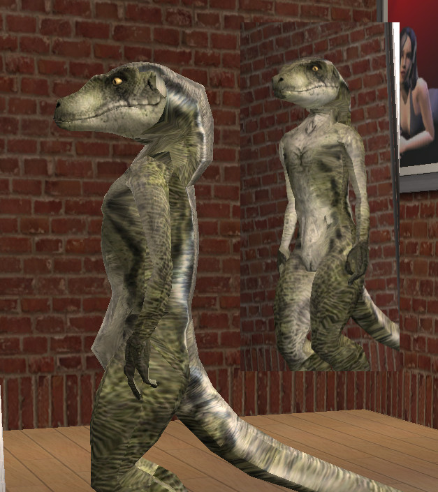Because the body mesh is so different you may notice some oddities during certain actions. The claws add some length to the fingers so they may disappear into the Sim's body at times. I've chosen to leave them the way they are because I prefer a raptor with decent-sized claws, even with a little clipping, over one with tiny claws that don't clip. And of course, the tail is going to clip all kinds of things.