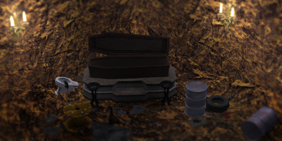 Sorry, the objects pictured are not included in the set! You can find them at The Sims Resource (tire, toilet), Mod The Sims 2 (coffin recolor, debris, papers), Garden of Shadows (coat and broken bottles) and Plumb Bob Keep (rats).